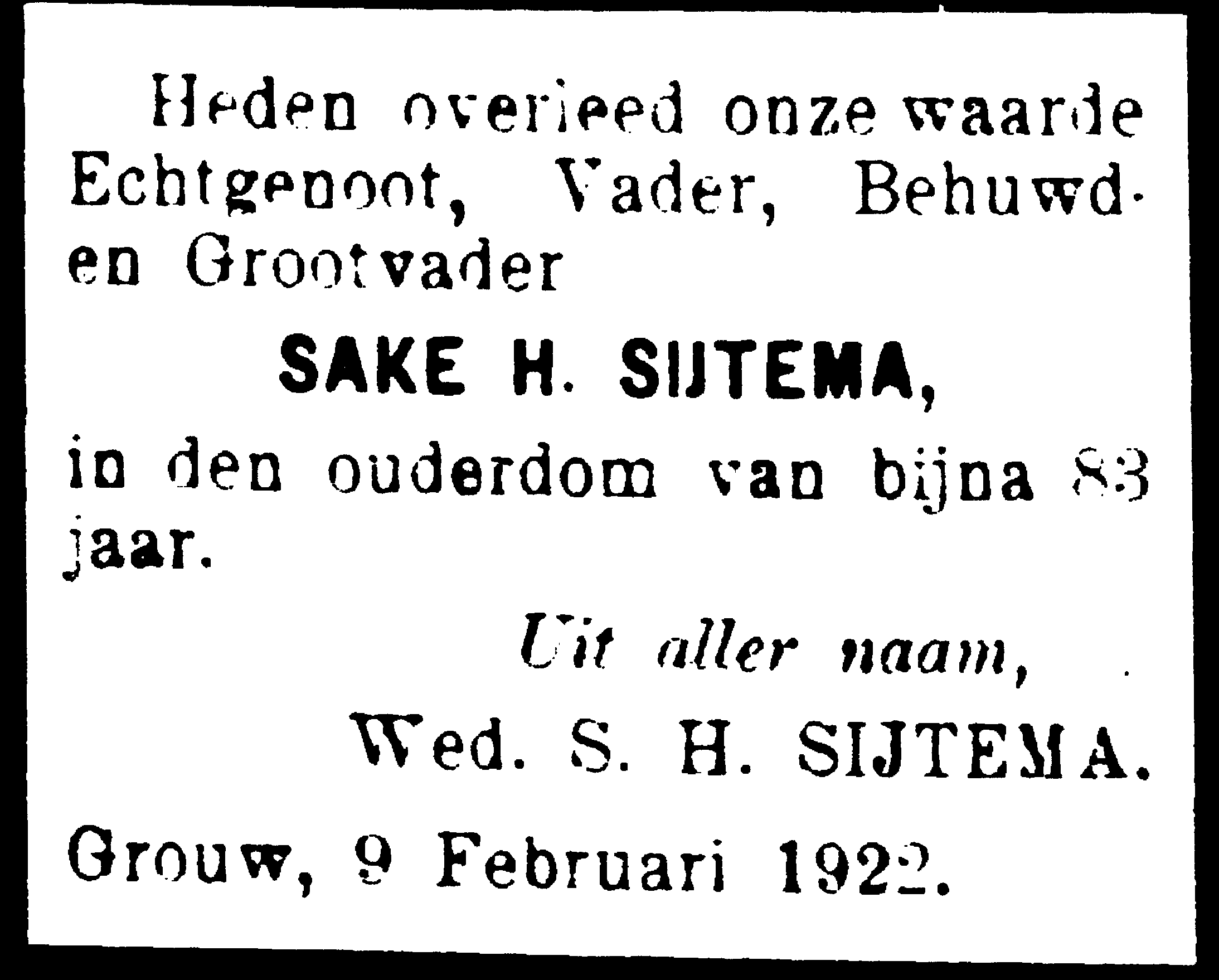 | 150 | Overlijden van Sake Hendriksz Sytema Status: Gelokaliseerd; Advertentie "Frisia" |